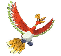 A rainbow Pokémon. On Sparkling wings of seven colors, Ho-oh leaves a rainbow behind at its files. Legend says that Ho-oh suppressed a war that scorched the land in ancient times. Its attack Sacred Fire can melt ice in an instant and also damage the target with burns. Ho.oh will show it solemn figure only for the most righteous trainers.