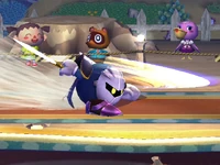 Meta Knight da un potente cuchillazo horizontal, es su ataque con mejor knockback (14%-19%). - Inferior: (ver imagen)