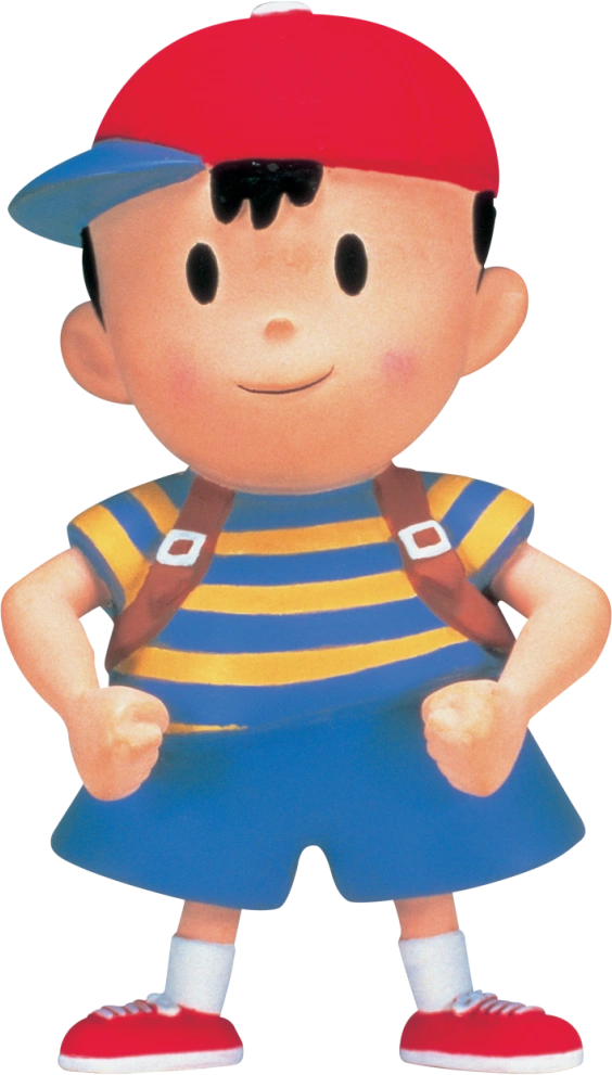 "Un garçon banal, dont la vie bascule lorsqu'il trouve une météorite et un extraterrestre sur une montagne proche. L'extraterrestre lui révèle une menace future, et l'aventure s'ensuit. Il peut utiliser une énergie psychique appelée PSY, et manier une batte et un yoyo. Ce brave gamin fait tout ce qu'il peut pour vaincre le diabolique Giygas."