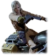 - Fait plusieurs sauts périlleux avant de poser en tenant son pistolet.