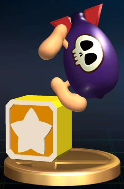 "Un dangereux p'tit gars. Vous voyez le crâne? Bombinet se déplace sur deux jambes, mais quand il tombe dans les escaliers ou de tout autre endroit en hauteur, c'est la tête la première, ce qui donne lieu à une explosion couvrant un périmètre important. Kirby peut l'avaler pour copier le don Foudre, qui permet d'expulser les ennemis de l'écran jusqu'au dernier! Attention, cette technique est à usage unique." |