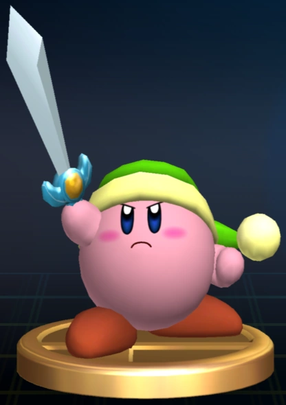"Kirby développe cette aptitude lorsqu'il avale un épéiste, ou simplement une épée. Kirby utilise alors son épée de main de maître et dispose même du rayon d'énergie de la Super tranche. Ce don d'imitation est, sans hésitation, le plus accessible de tous." |