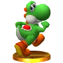 "Cette créature provient de Yoshi's Island. On trouve des Yoshi de différentes couleurs, tous de caractère doux. Quelle que soit la situation, ils semblent toujours s'amuser. Les Yoshi utilisent leur langue pour attraper et avaler leurs ennemis, et peuvent ensuite les enfermer dans des œufs qu'ils couvent. Ils servent aussi de monture à Mario."
