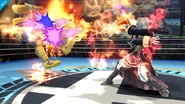 Arcfire+ has longer range and when it touches the ground or an opponent it explodes rather than creating a pillar of flames; this makes it less useful in combos as it launches opponents right away instead of causing the hitstun that the default variation does, making it difficult to follow up. The move launches opponents farther and this in addition to the range on it makes better for zoning than the default variation. Since it does not create a pillar of flames, it is ill-suited for edgeguarding and setting up ledge traps since it cannot force opponents into taking a ledge option. The move also has longer starting lag, so it is easier to interrupt before the projectile is launched.