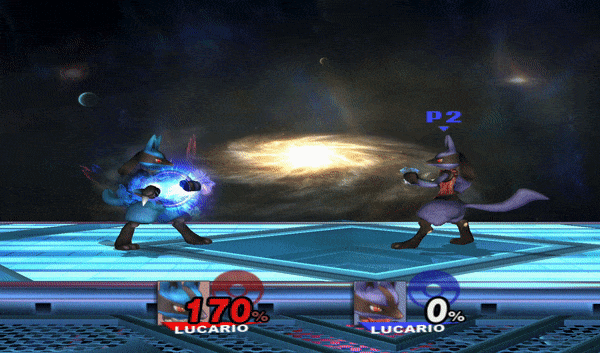 Lucario and Aura Sphere stand out from others in regard to this technique, however. When performed with a directional jump, Lucario will not only turn around but also, with correct timing, his jump animation will reverse itself entirely, essentially bringing Lucario back to the origin of the jump.