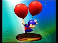 Balloon Fight still receives some attention in Melee. The anonymous protagonist of the game, the Balloon Fighter, is a collectible trophy in Melee, and the Flipper - an obstacle from Balloon Fight - is a usable item and as well as a trophy. The original background music for Balloon Fight can also be heard in the Icicle Mountain stage as alternate music.