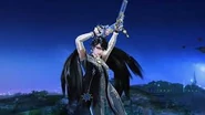 - Down Air Attack: Does a falling axe-kick attack that can Meteor Smash if it hits at the tip of her heel. It is extremely powerful against grounded opponents. It has a very low duration for a stall-than-fall move, and can be cancelled by Witch Twist or mid-air jump to negate most of the ending lag. It is her strongest air attack. Based on the standard air kick in Bayonetta. 14%