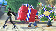 - The screenshot of Bayonetta walking with Mario and Luigi, the latter of who are carrying gift boxes for Bayonetta (with the image itself derived from the Super Smash Bros. for Nintendo 3DS/Wii U Official Site), references the opening cutscene in Bayonetta 2 which features her and Enzo Christmas shopping, with Enzo being forced to carry the multitude of Christmas gifts she had bought.