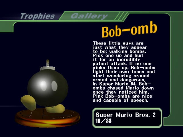 Bob-ombs are enemies in the Mario series, and first appears in Super Mario Bros. 2, where they walk around and explode after a short time, though their self-destruction can be delayed by jumping on it (which cannot be done in Smash Bros.). The ability to pick up Bob-ombs also originates from the same game.
