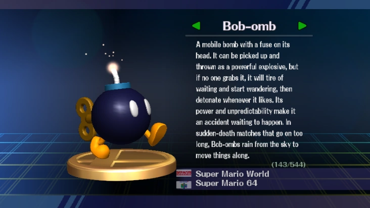 A mobile bomb with a fuse on its head. It can be picked up and thrown as a powerful explosive, but if no one grabs it, it will tire of waiting and start wandering, then detonate whenever it likes. Its power and unpredictability make it an accident waiting to happen. In sudden-death matches that go on too long, Bob-ombs rain from the sky to move things along.