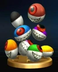 No matter their size and color, though, a Trophy Stand thrown at them will transform them into the same trophy, which shows all of their colours. They bear a resemblance to the Pokémon Voltorb and Electrode, a veteran of Smash Brothers and may be a nod to them.