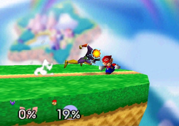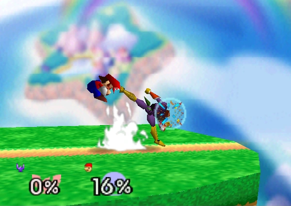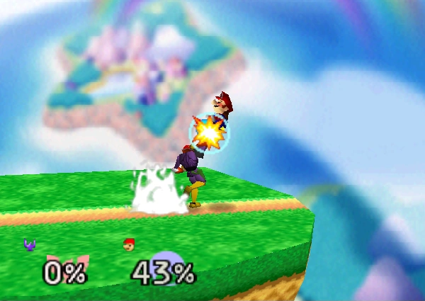 11-14% | Captain Falcon stomps downward with both feet, meteor smashing opponents who come in contact with Captain Falcon's legs. If the attack connects with opponent on the ground, it will, depending on their damage percentage, keep the opponent in place or bounce them up at a very slight angle, which can lead into a follow-up attack. | ||