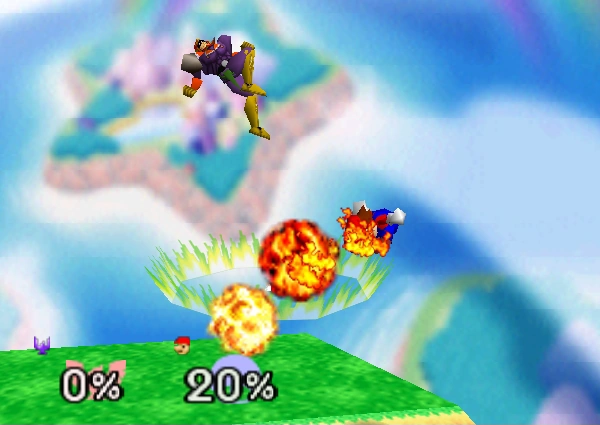 Falcon Dive | 15-20% | Captain Falcon leaps into the air. If he comes in contact with an opponent, he will grab them and release them in a fiery explosion. Normally this move makes Captain Falcon helpless, but if he connects with the throw, he's free to use the same move again without landing first. | |
