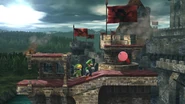 When the match begins, players begin the fight on a small section of the unnamed castle's roof, which is bombarded by heavy fire from catapults. Eventually the floor shatters as the castle defenses waver and players fall into the throne room, which has breakable statues, four platforms and a solid floor with no drop-off points. Two platforms are held in place by destructible statues, just like Luigi's Mansion, which means that this could cause problems for projectile usage. There are also two hanging cloth emblems above serving as platforms. Players later fall again into the underground, which contains one stone platform balancing on a stone spire in the midst of a lava cavern. A part of this area is slightly elevated. After a while the stage will transition back to the top of the castle.
