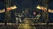 Most of the chapters in the Fire Emblem series happen indoors where you're trying to seize the throne that is usually guarded by a powerful boss. The Black Knight is one of the main villains, who is in black, heavy armor. In the indoor part of this stage can be seen the Black Knight in front of his throne in the background. Both Path of Radiance and Radiant Dawn have soldiers that can change their class to "Halberdier". Those Halberdiers can be seen in the indoor part of this stage in front of the Black Knight in the background. Fire Emblem: Seisen no Keifu was the first Fire Emblem to feature a background during conversations. One of the backgrounds resembles the entire indoor room of this stage. Fire Emblem: Fuuin no Tsurugi was the first Fire Emblem to have destructible terrain. For example, a wall has a certain amount of HP when the player attacks the wall enough to where the HP reaches zero the wall crumbles. The statues in this stage could be a reference to the destructible material.