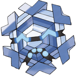 Cryogonal debuted in the Generation V games, Pokemon Black and White. It resembles a living snowflake: a flat blue body, composed of ice, and is hexagonal in shape. It has deep-set eerily glowing blue eyes and an open mouth from which it forms chains of ice crystals (which are in 2 cracks on its body). Its face is always locked in this aggressive expression.