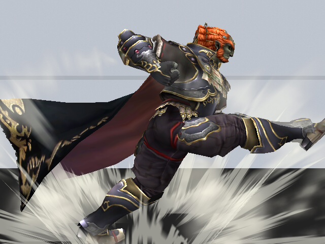 - Ganondorf: Kicks strongly in front of him, then shifts his foot to kick behind him. If hit with first kick, the attack mostly carries opponent to second hit. Is somewhat laggy.