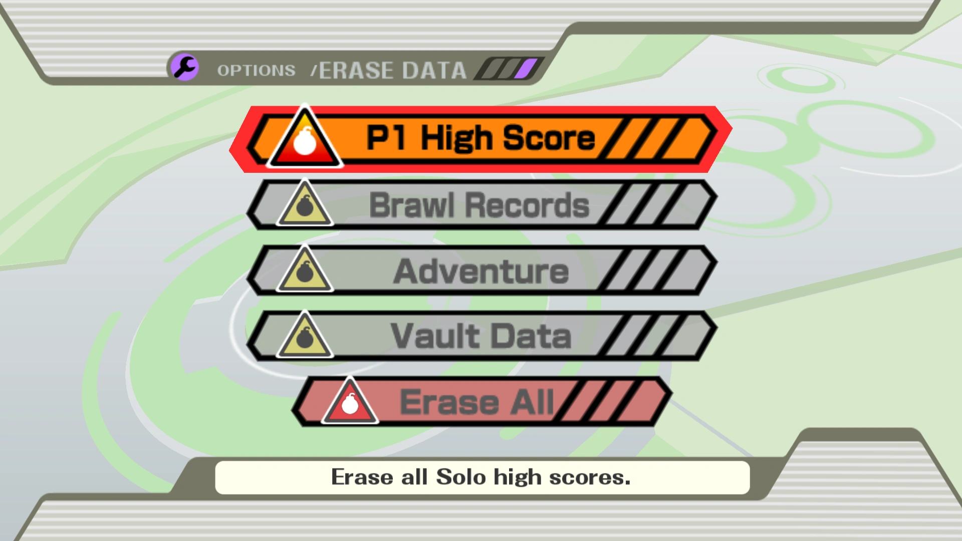 - In the first two installments --Smash 64 and Melee-- if the player chooses to erase all data --by selecting "Erase All"-- the game asks the player two times if they are sure they want to lose that data (giving them two prompts). Brawl and Smash 4 --unlike the previous two installments (Smash 64 and Melee)-- when "Erase All" is selected --if the player wants to lose that data-- the game asks the player and prompts them three times (three prompts). However, in Smash 4, this works with the A, B, X, and Y buttons on the 3DS for the 3DS version and the Wii U GamePad on the Wii U in the Wii U version. In Brawl, the first prompt plays a siren, the second one plays a sped up version of the siren, and the third and final plays an alarm similar to Melee's challenger approaching theme. Smash 4 presents three prompts (similar to Brawl for "Erase All"). However (out of the three prompts), the first one is silent, while the second and third play the siren and the sped up siren.