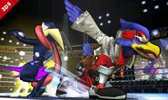 He and Fox are able to communicate with crew mates on the stage Corneria. By slightly pressing the down taunt, Fox and Falco will kneel down. Then Peppy and Slippy (and depending on who the player is controlling, Fox or Falco) will give the player tips or proceed to have comedic banter.