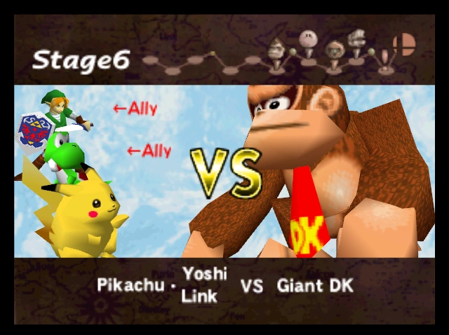 He first appeared in Super Smash Bros.' 1P Game as a giant version of Donkey Kong. DK has little knockback when attacked, while his own attacks send opponents flying, making him a formidable opponent on higher difficulties. Because of this, players face him with two regular-sized allies. It is also possible to play as him using the Debug menu code or change 1 player to specific character.