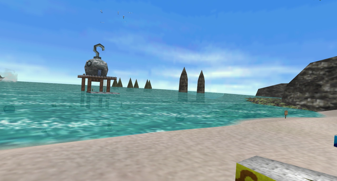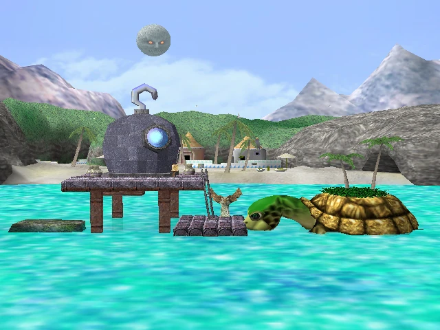 The The fighters battle in front of the Marine Research Lab in the Great Bay Coast from The Legend of Zelda: Majora's Mask. Great Bay is surrounded by water, which characters can fall through, therefore KO'ing them, although in Super Smash Bros. Ultimate, this was changed to allow fighters to swim around in the water. The left side of the stage consists of three platforms. The bottom ones have enough space for two fighters, and the left one floats and reacts to the fighters' weights by rocking. The raised platform, which has barely enough space for four characters is solid: This can be exploited by throwing opponents against its bottom to cause a stage spike and possibly an early KO.