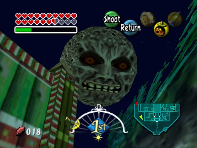 In Majora's Mask the moon (depicted as having a hideous face) is falling towards Termina thanks to the titular antagonist Majora, and Link has three days to stop it from falling. The moon can be seen getting closer and closer as time progresses in Majora's Mask and if Link fails to play "The Song of Time" before time is up, it will destroy Termina and Link will have to do the cycle all over again. Ironically, Termina's name is named after the word terminal, meaning "will perish soon." Once the player has completed all four dungeons (representing four giants), the player must play the song Oath to Order to get all four of the giants to come, and grab the moon to stop it from falling. In this stage in Melee, the moon can be seen falling closer towards the ground as time progresses. When the moon gets to a certain height, the four giants come and stop the moon, but the giants now push the moon back where it was previously rather than destroying it like in Majora's Mask.[1]