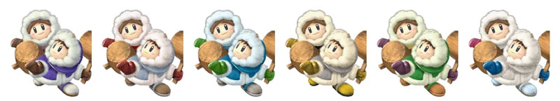 The Ice Climbers also had some purely cosmetic changes. Their orange costume was removed. With their blue costume, they can look almost exactly the same (one Ice Climber's parka has just a small shade difference). The white one is almost the same, but the gloves are different colors. Lastly, squall hammer now sends off flakes of ice if both Ice Climbers are present.
