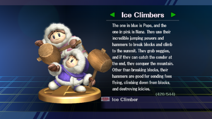 - Along with Pokémon Trainer, Diddy Kong, and Jigglypuff, the Ice Climbers are one of the only characters to have a unique "Defeated/No Contest" pose different from the traditional hand-clapping, with their head down while rubbing their eyes, making it seem as if they are crying. This pose is a reference to the one the duo make in Ice Climber after failing in a bonus level.