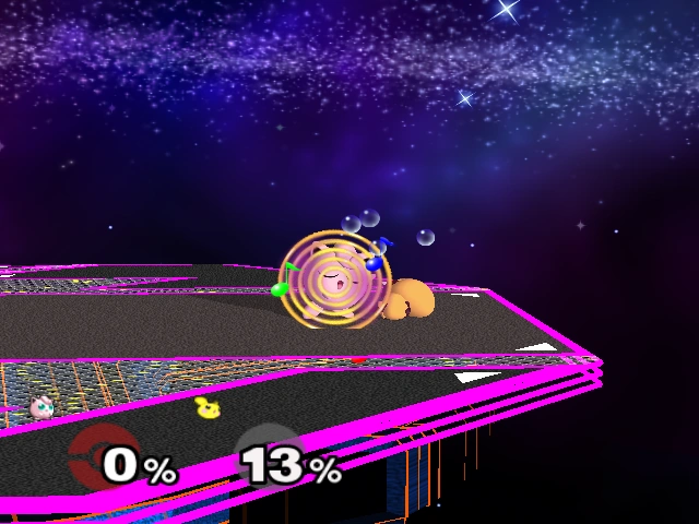 Rest | 28% | Jigglypuff dozes off and takes a nap. Normally, this leaves Jigglypuff vulnerable, but there is a small hitbox at the beginning of the move that deals extremely high damage and knockback, being able to KO most lightweight characters at low percentages. | |