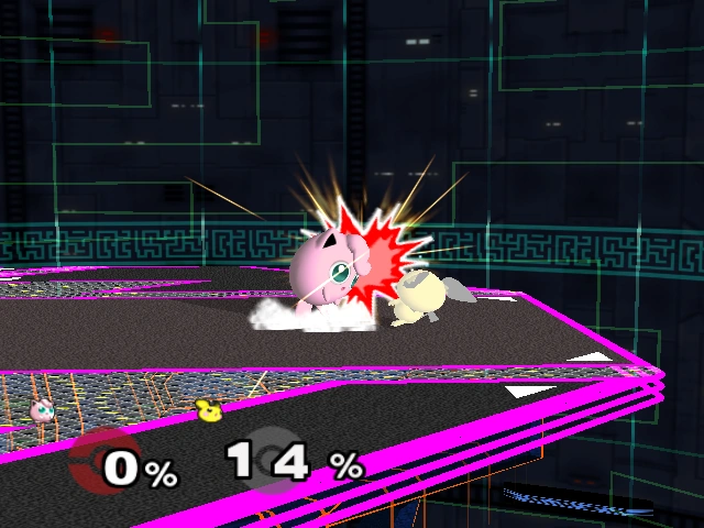 14% | Jigglypuff does an upwards headbutt. There is a smaller hitbox in Jigglypuff's head that deals 15% damage but never connects due to overlapping the bigger hitbox. | ||