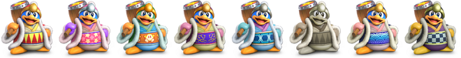 - In the French and European Spanish versions, the name tag and voice clip from the announcer on the victory screen is slightly different from the one used on the character select screen, instead featuring a noticeable translation of "the" (le Roi Dadidou and el Rey Dedede, respectively). This trait is shared with Wii Fit Trainer, Pokรฉmon Trainer, Villager, Ice Climbers, Inkling, Hero, and the Mii Fighters. Additionally, he and Duck Hunt are only two fighters having this trait in the European version, but not in the American version.
