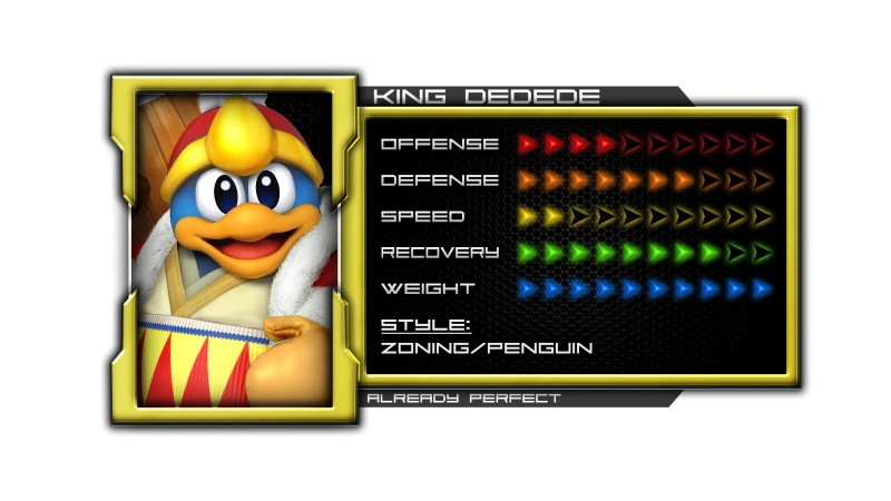 King Dedede is a powerhouse, alongside Bowser, Donkey Kong and Ganondorf, with powerful attacks that have considerable range. He is one of the heaviest characters in the game, boasting from having the highest vertical endurance in the entire game, thanks to his falling speed and weight combined. Due using a weapon, his disjointed hitboxes gives him advantage over many opponents, and because of this, his gameplay style is mostly oriented around Zoning, however, he also has an incredible grab game that allows him to play as a Half-Grappler. These two playstyles make Dedede a formidable defensive character.