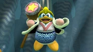 Design-wise, his proportions and appearance reflect his visual in the anime Kirby: Right Back at Ya!, with a smaller head and bulkier body; his pupils are also notably smaller, giving him a less "innocent" look as seen in the Kirby games. His clothing is more detailed, with the fuzz in his robes and crown being more accentuated. He retains the same voice clips from Brawl, however they have been digitally. Lastly, he now has very exaggerated expressions for mostly everything.