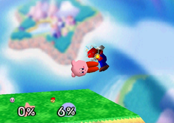 Kirby's Down Aerial is used extensively for edge-guards. Its large knockback can destroy many characters (such as Captain Falcon, Mario, Luigi, and DK). It can also be comboed easily into an Up Tilt.