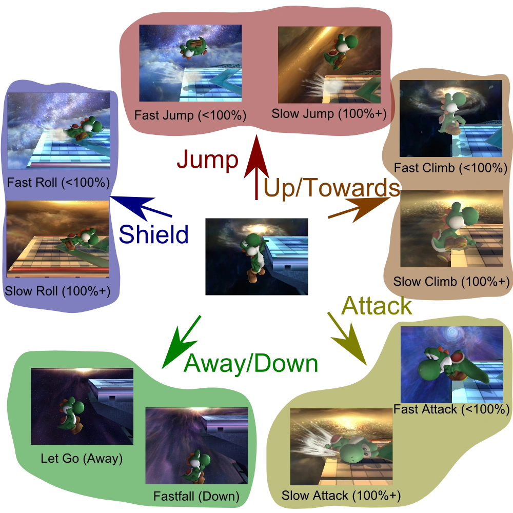 - Let Go: By pressing the Control Stick away from an edge, the character will let go. This may seem counter-productive at first, but it is useful if the character wishes to double jump and then air dodge, or for certain other purposes such as using Yoshi's double jump launch resistance. It should be noted that Toon Link wall jumps away from the wall after letting go, which is a useful alternate to jumping in a few cases. Also, depending on the character, double-jumping then using an aerial attack can be faster than using the recovery attack.