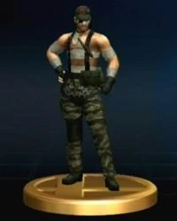 Naked Snake's trophy depicts him wrapped in bandages, referencing the severe injuries he received after being beaten by The Boss and thrown into a raging river and after he was tortured by Colonel Volgin.