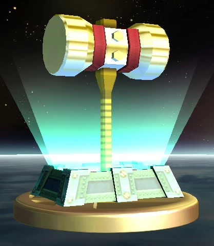 A hammer that glows with golden light. It's easier to swing than a normal hammer, and more powerful too. If you tilt the Control Stick and press the attack button repeatedly, you float in midair. It's a very powerful item, but one that rarely appears. There's also a Golden Squeaky Hammer that does absolutely no damage at all. It's what you would call a fake.