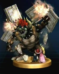 Bowser, transformed into the terrible and brutal form first seen in Super Smash Bros. Melee. While in this form, he cannot be stunned or budged. His appearance is so fierce, it's as if he doesn't even belong in the Smash Bros. universe. He cannot maintain this form for long, so dealing out damage efficiently is key.