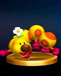 A large caterpillar characterized by a flower on its head and a huge nose. Wigglers typically just walk around minding their own business, with no hint of malice. However, they lose their flowers when jumped upon and fly into a rage, turning bright red and chasing Mario. In Yoshi's Island, certain Wigglers appear as butterflies, with grown wings and flight capabilities.