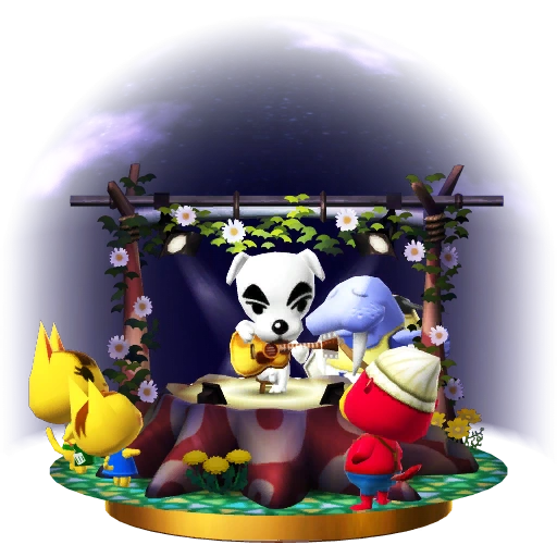 His fans can't wait for Saturday evenings. Why? Because K.K. Slider performs live! The crowd goes wild when K.K. Slider plays some of his greatest hits, like K.K. Samba, K.K. Waltz, and K.K. Stroll, on his acoustic guitar. He sometimes even takes requests! Other days, you can find him spinning tunes at Club LOL as a DJ. Fans of this groovy dog just can't wait for his live show every Saturday night. With his trusty acoustic guitar, he'll treat you to such delights as the K.K. Samba, the K.K. Waltz and the K.K. Stroll. He even takes requests! In Animal Crossing: New Leaf, you can also find him on other days of the week working as a DJ at Club LOL.
