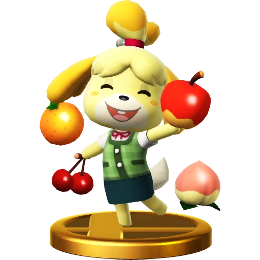 Isabelle is the mayor's highly capable secretary. She can be forgetful sometimes, but you can always count on her for information about the town. She wears her hair up in a bun that makes her look like a shih tzu. Mostly because she is one! She also has a twin brother named Digby. Isabelle's the mayor's secretary, and you couldn't ask for someone more on the ball! Well...maybe you could, but she's still full of useful info about life in the town. With her fringe and tied-up hair, she looks just like a shih-tzu! That's because she is one. And so is her twin brother, Digby.