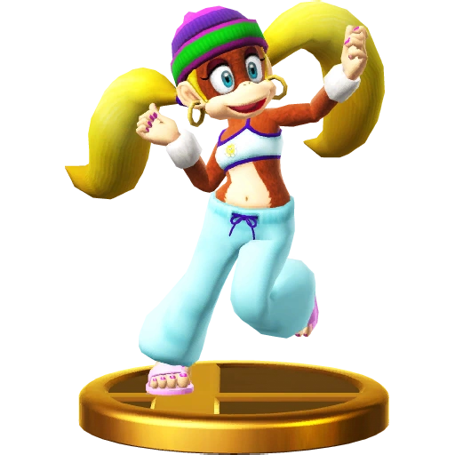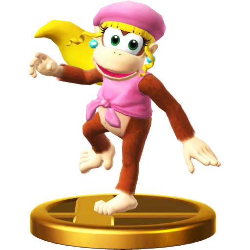 Diddy Kong's girlfriend. She loves to adventure with him. Her ponytail isn't just for show—she can use it to swim faster, soar in the sky, and even lift barrels! With hair that does all that, you can bet she takes good care of it! Dixie Kong is all about style and substance. Just look at her ponytail. It's not just a fashion statement – she can spin it to fly up into the air, swim against strong currents, and even throw barrels with it, no problem! No wonder Diddy Kong likes her!