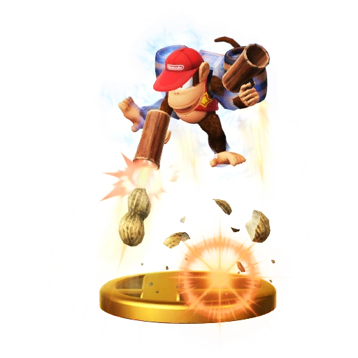 Diddy Kong's Final Smash is an attack on all fronts! Diddy takes to the air with his Barrel Jet, tackling opponents as he fires explosive shots from his Peanut Popguns. His Final Smash is nearing its end when he begins flashing, so get as close to your foes as you can—the Barrel Jet will explode at the end of this Final Smash! With a Peanut Popgun in each hand, Diddy showers his foes with a hail of explosive destruction. This Final Smash lets him fly freely through the air, dealing damage to anyone in his way. When his body starts to flash, that means the Final Smash is about to end, so try to catch your foes in the Rocketbarrel Pack's explosion!