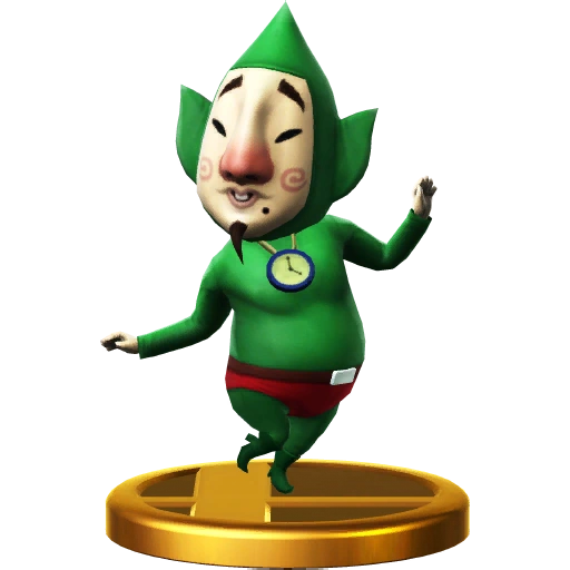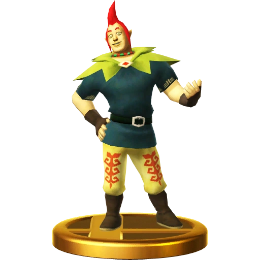 Never seen without his green bodysuit, it's a wonder this strange little man is single at 35, isn't it? In The Legend of Zelda: The Wind Waker, he was locked up for causing trouble. In Smash Bros., he'll appear on the scene, shout "Kooloo-Limpah!" and unleash all sorts of madness. Single. 35 years old. Dressed head-to-toe in green. In The Legend of Zelda: The Wind Waker, this wannabe fairy gets locked up for being a "troublemaker". And he's one in this game, too! His magic incantation, "Kooloo-limpah!", causes all sorts of madness that'll really shake up your battle.
