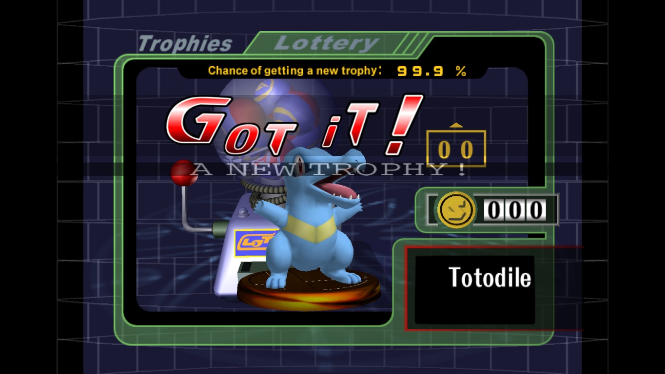 The player winning a Totodile trophy in SSBM.