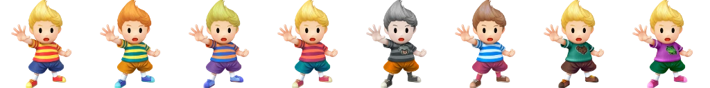 - Down Taunt: Lucas creates PSI-energy blasts with his fingers and makes a little grunt, moving his arms in a sideways motion.
