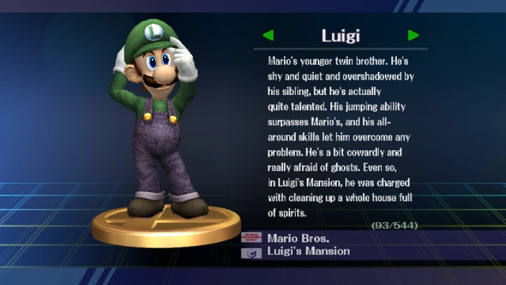 - Luigi's trophy pose is similar to Mario's idle pose in Melee, in where he is adjusting his hat.