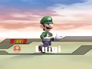 Up: Does a variety of humorous poses very quickly in a set order: Faces the screen with one hand on his waist, the other giving the peace symbol, next he turns to the right slightly, pointing his hands that direction. Then, he places his right hand just below his mustache, as if he is thinking. Then he turns away from the screen, crouching, as if he's sad, and finally, he faces the screen once more, with both hands on his face, giving a frightened look, reminiscent to the box art of the Nintendo Gamecube game Luigi's Mansion. The switch between each expression is so fast, it can't be seen unless the game speed is slowed down a bit. He also makes a sound during each expression: Hoo! Hah! Hee! Hey! Hmm!