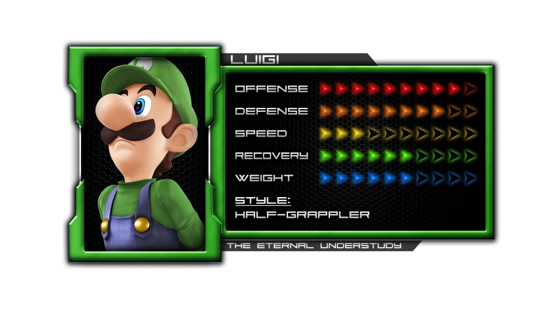 Luigi is a Half-Grappler kind of character. A good part of his gameplay relies on his Down Throw combos, that, despite being nerfed in recent patches, it is still a force to be feared. His stats aren't as balanced as Mario's, but he is formidable at many things.