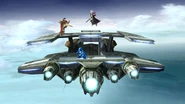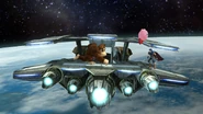 The stage itself has few hazards - the ship tilts to-and-fro as it makes turns and avoids shots from other ships, and the ledge is quite thin, so recovering characters may be caught under the ledge, like what happens in Melee's Battlefield.